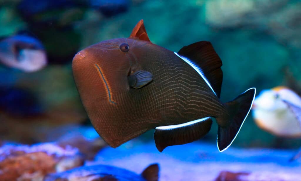 Biology : This triggerfish frequents reefs in clear waters, particularly drop-offs, its black colouring allowing it to blend into the darkness of the open sea.