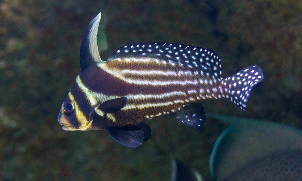 Biology : A discreet fish, the spotted drum frequents overhangs and cavities. As adults, they have numerous stripes and spots. Younger individuals are distinguished by their large sickle-shaped dorsal fin. Juveniles often stay close to sea urchins and moray eels, which serve as their protectors.
